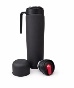 Termo media manija de 1L fabricado con doble de capa de acero inoxidable. Viene con pico cebador y tapa. Muy práctico al momento de cebar por la manija.